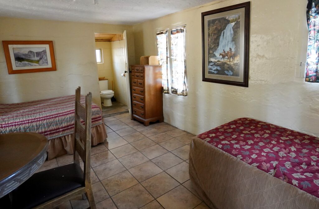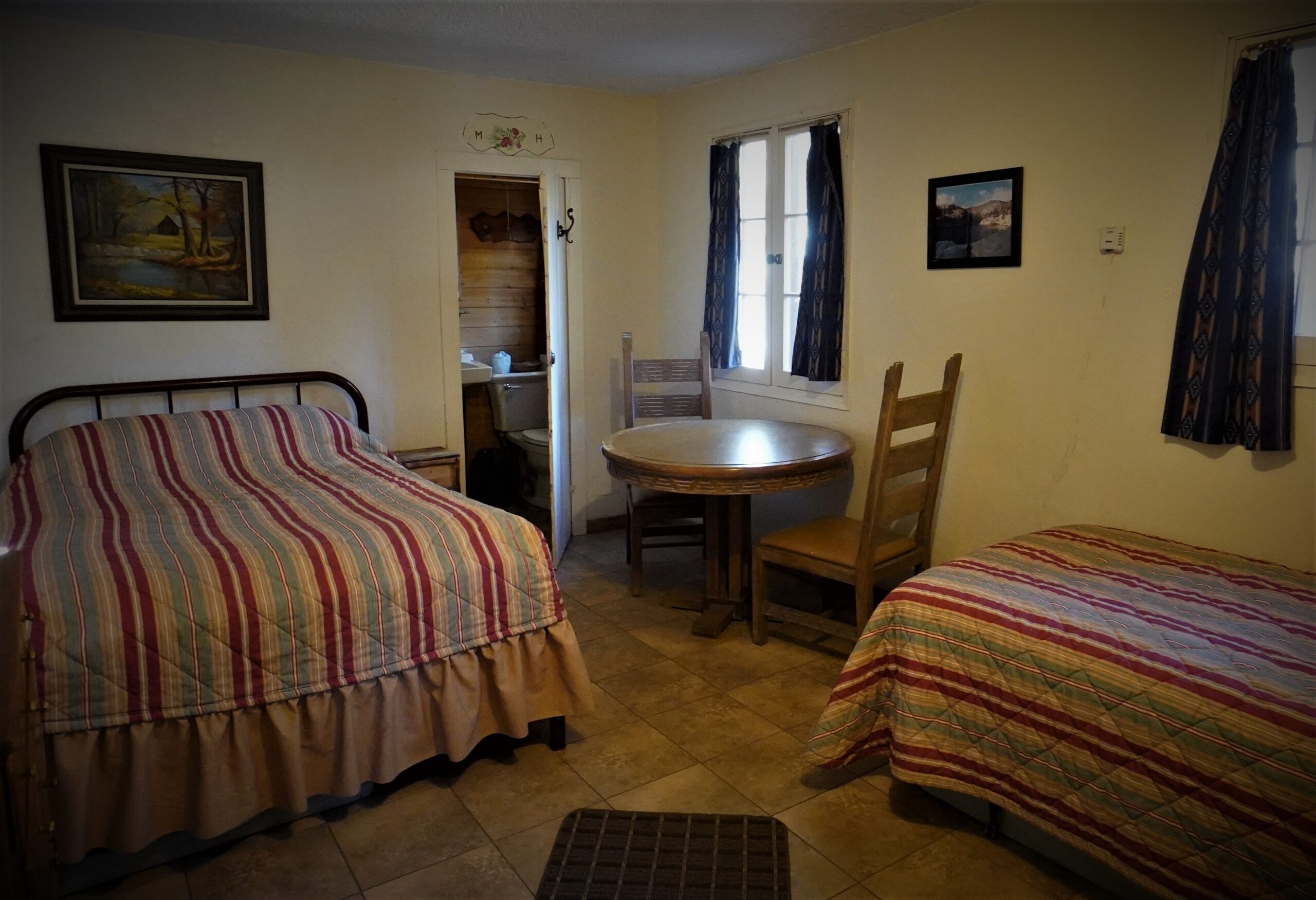 Cabins 1 & 24: The One Room Stone Cabins for 1- 2 people (3 max.) have one double bed and one twin bed with all bedding, towels and toiletries furnished. There is a Table & chairs for 2. They have a flush toilet and hot water sink (no shower, private room showers at the bathhouse). The cabins have regular resort generator electricity for lighting (no plugins) and a gas wall heater.