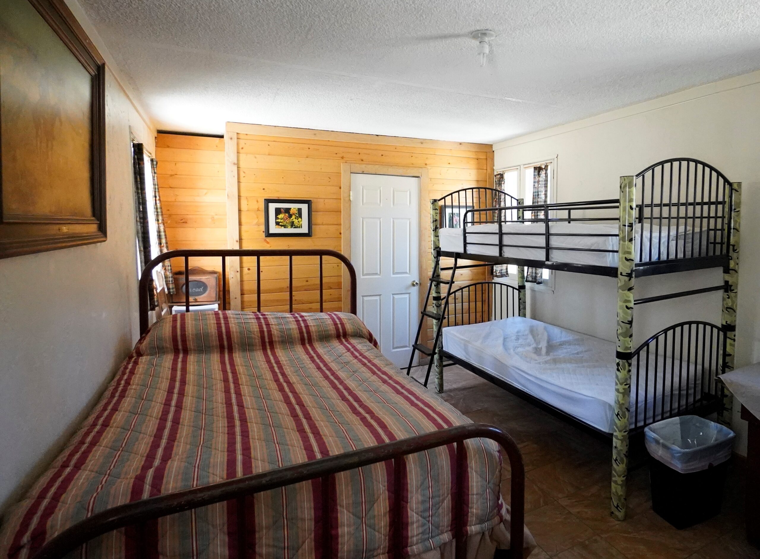 Cabins 8, 9 & 10: One Room Wood Frame Family Cabins for 1- 4 people (max 5) are furnished with one double and a twin bunk bed. Only the double bed is furnished with bedding, so bring the kids sleeping bags for the twin beds. The cabins have an inside flush toilet and hot water sink (no shower); towels and toiletries are furnished and an inside table & chairs for four.