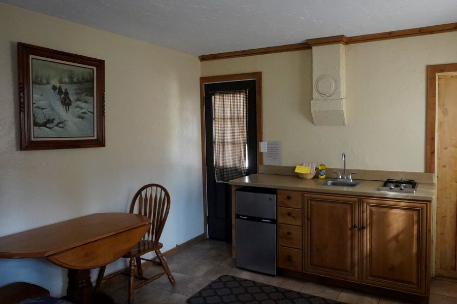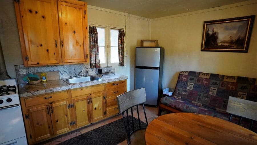 These Historic cabins have a full kitchen with a futon in the kitchen. Electric lighting is by the resort generator (but no plug-ins). The bedroom has a double bed and wall heater. There is a flush toilet, hot water sink and a shower with a complete assortment of towels and toiletries. Outside there’s large picnic table, a fire pit/grill for a campfire or Bar-B-Q use.